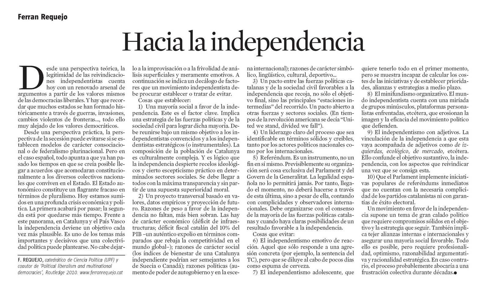 "La legalidad española no lo permitirá jamás. Por tanto, llegado el momento, no deberá hacerse a través de esta última, sino a pesar de ella, contando con complicidades y observadores internacionales." (Ferran Requejo, la Vanguardia)