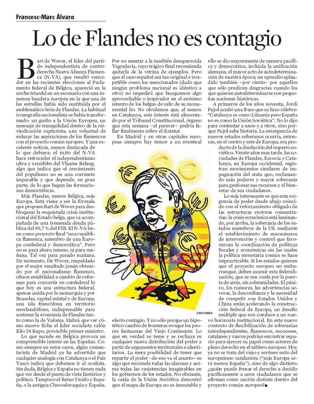 "Alguna cosa fa olor a Dinamarca quan els dos grans partits han de sortir en tromba a tranquil·litzar les forces vives de l'unionisme. Però la realitat, com dèiem, és tossuda, i no és cap diari sospitós de vel·leïtats separatistes, sinó El Periódico, qui publica una enquesta en què el sí a la independència obté una majoria més que sòlida enfront del no. Cantin papers i mentin barbes, senyors." (Sebastià Alzamora, Avui)